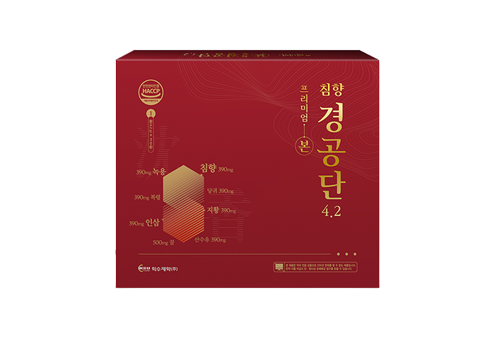 침향(인도네시아산) 9.29%(390mg), 녹용(러시아산) 9.29%(390mg), 인삼(국산) 9.29%(390mg), 당귀뿌리(국산) 9.29%(390mg), 산수유(국산) 9.29%(390mg), 지황(국산) 9.29%(390mg), 벌꿀(국내산) 11.9%(500mg), 복령 9.29% (390mg), 효소처리스테비아 0.1%(4.2mg), 글리세린 22.97%(965.8mg)