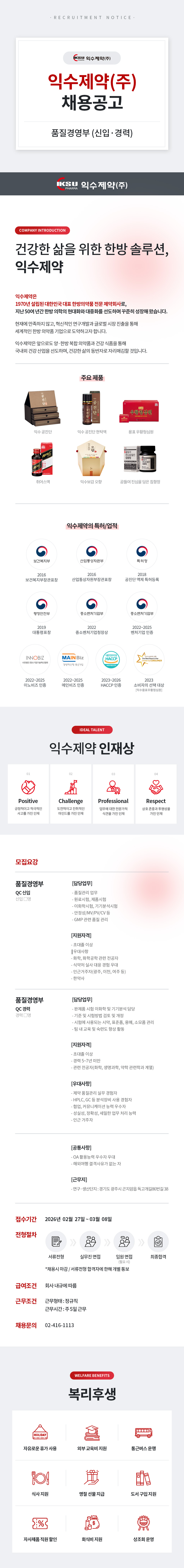 익수제약(주) 품질경영부 QC 신입ㆍ경력사원 채용공고