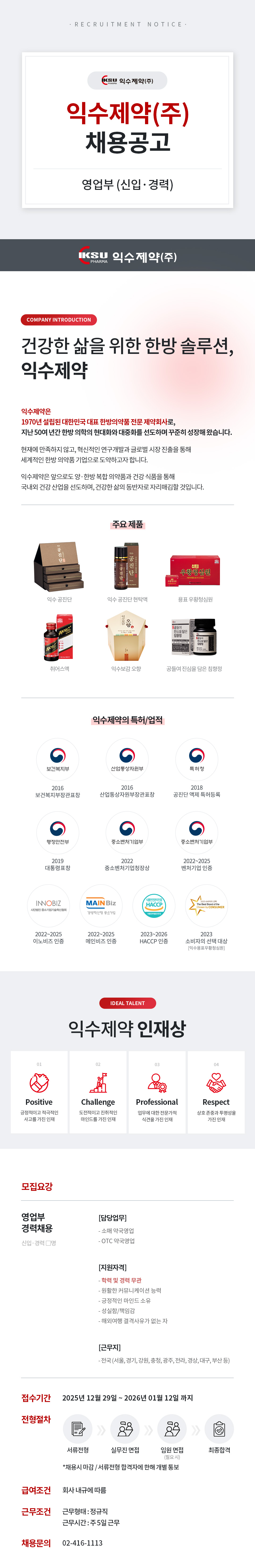 익수제약(주) 영업부 신입·경력사원 채용공고